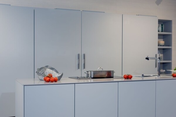 Der Samtmatteffekt bei Küchenmöbelfronten wird durch ein besonderes Silikatmineral im Lack erreicht, das durch seine Porosität das einfallende Licht „schluckt“ und deshalb matt und samtig wirkt. Manchmal werden diese Oberflächen auch „pelle di pesca“ (= Pfirsichhaut) genannt. Die Porosität macht diese Oberfläche gegen stark gefärbte Flüssigkeiten wie z.B. Johannisbeersaft, Tomatenketchup oder Rotwein aber auch Fettspritzer empfindlich. Hier gilt ganz besonders, dass umgehend gereinigt werden muss. Ist der Fleck erst einmal eingetrocknet, kann er meist nicht mehr vollständig entfernt werden. Man kann zwar versuchen, Flecken mit einer weichen Bürste und einem milden Haushaltsreiniger zu behandeln, aber meist ohne großen Erfolg. Mit aggressiveren Mitteln oder Scheuermittel wird die Oberfläche aufpoliert und es entsteht ein hässlicher Glanzfleck.
